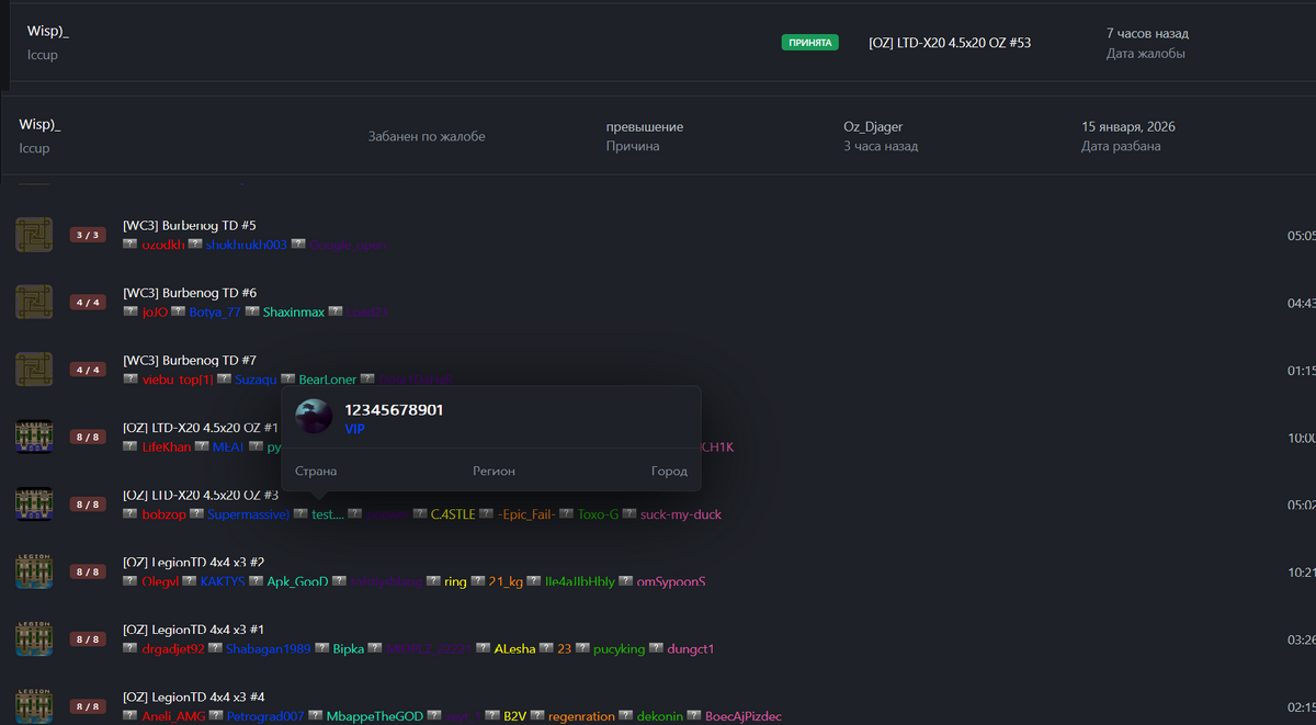 frostkok37 опубликовал тема в ОффтопикПолучен бан по неизвестной причине. В момент игры произошёл разрыв соединения у синего игрока (AztecPower) и шел отсчет времени, затем после того как он отлагал, у меня появилась надпись "Выйти из игры" Я не предпринимал никаких действий для выхода из игры, более того я играл с другом, solovey37rus и в этот момент с ним был в дискорде и может подтвердить. Так же я ниразу не ливал, из всех игр. Прошу разлбанить ник - frostkok37